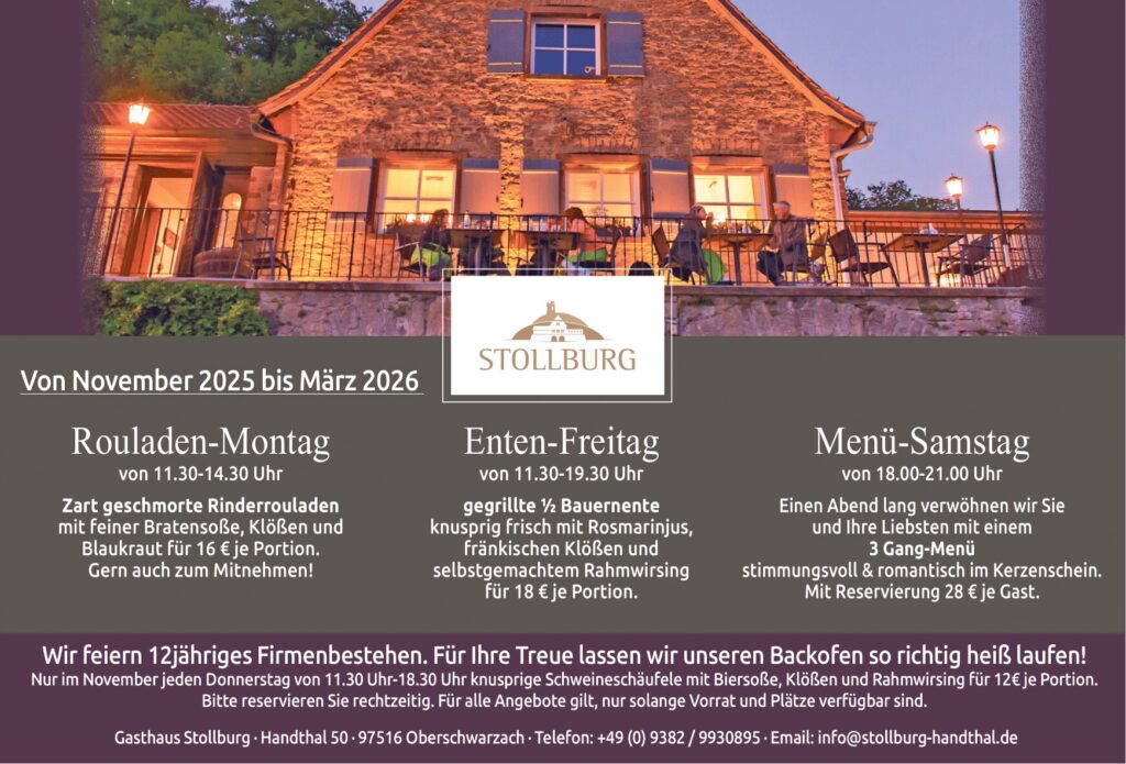 Die für unser Lokal namensgebende Ruine Stollburg, in der Walther von der Vogelweide einst geboren sein soll, ist nur eines der Highlights Handthals und der Region Steigerwald. Zahlreiche besondere Orte, Aussichtspunkte und Wanderwege gibt es hier noch zu entdecken.