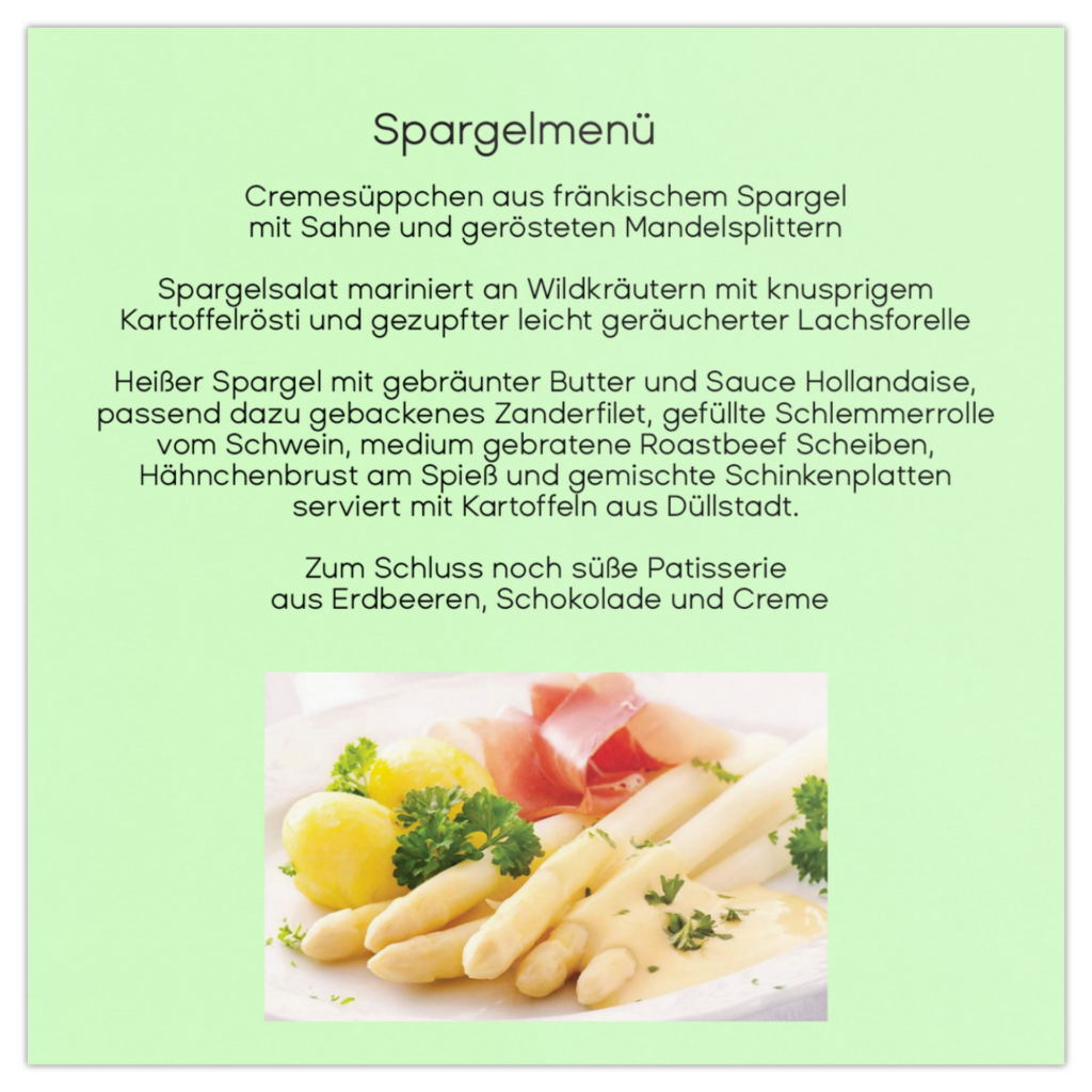 – seit mehr als 20 Jahren. Wir servieren Ihnen fränkische, traditionelle Küche aus unser Region. Freuen Sie sich auf die Kreationen von unserem Küchenchef Marcel Adler. Im Frühling servieren wir Ihnen feine Fischgerichte aus unserem Hausbassin, fränkische Klassiker und leckere Spargelgerichte ab April.