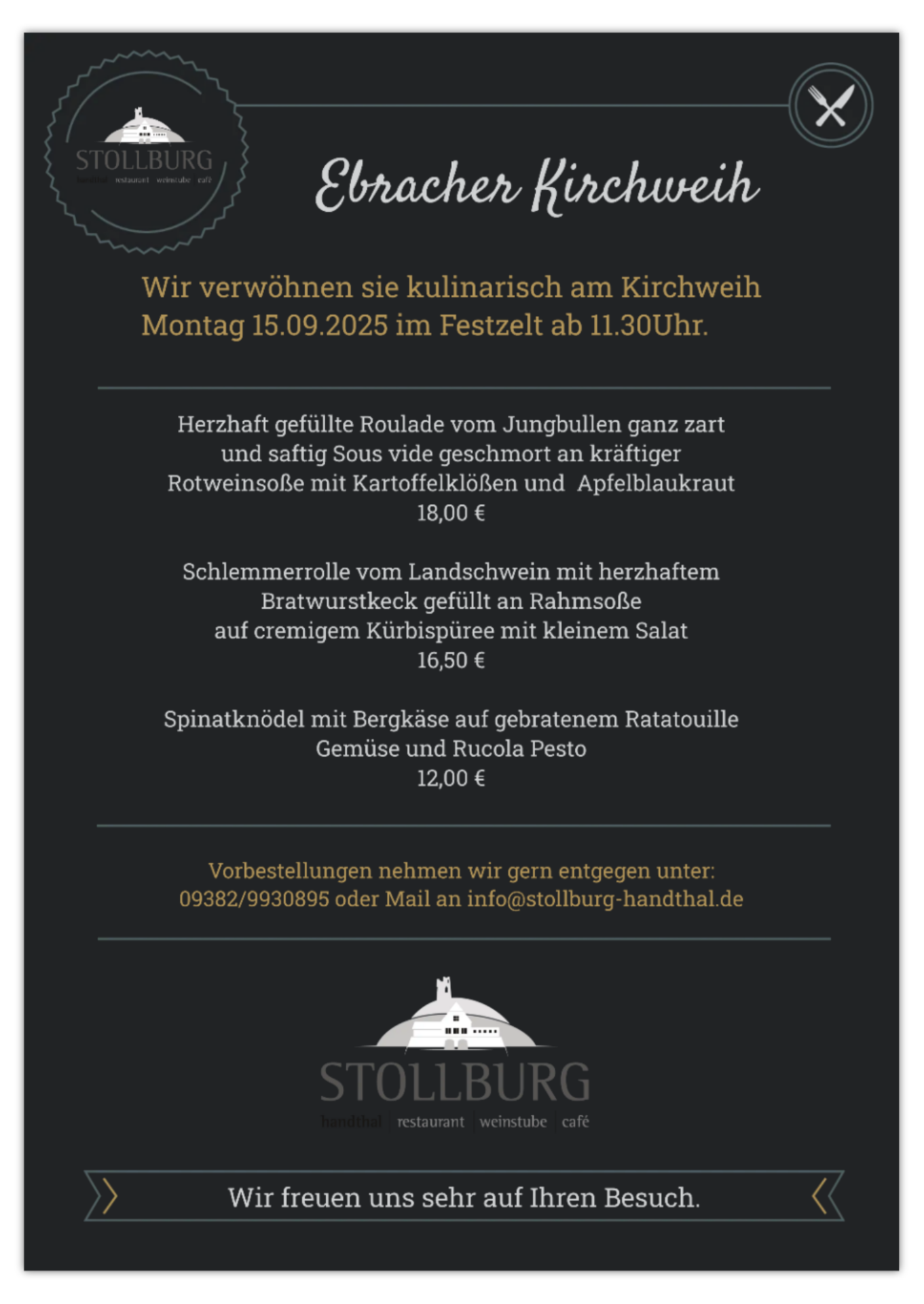 Handthal 50, 97516 Oberschwarzach (OT Handthal) Do - So: ab 11:30 Uhr durchgehend warme Küche bis 20.00 Uhr, und Montag bis 15 Uhr 09382 / 99 308 95
